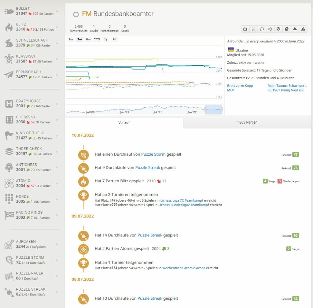 Nebenbei schaffte er es auch auf Lichess in allen Disziplinen 2000 Elo zu erreichen, wer das einmal selber probiert hat, weiß wie schwer es ist, dies zu erreichen.