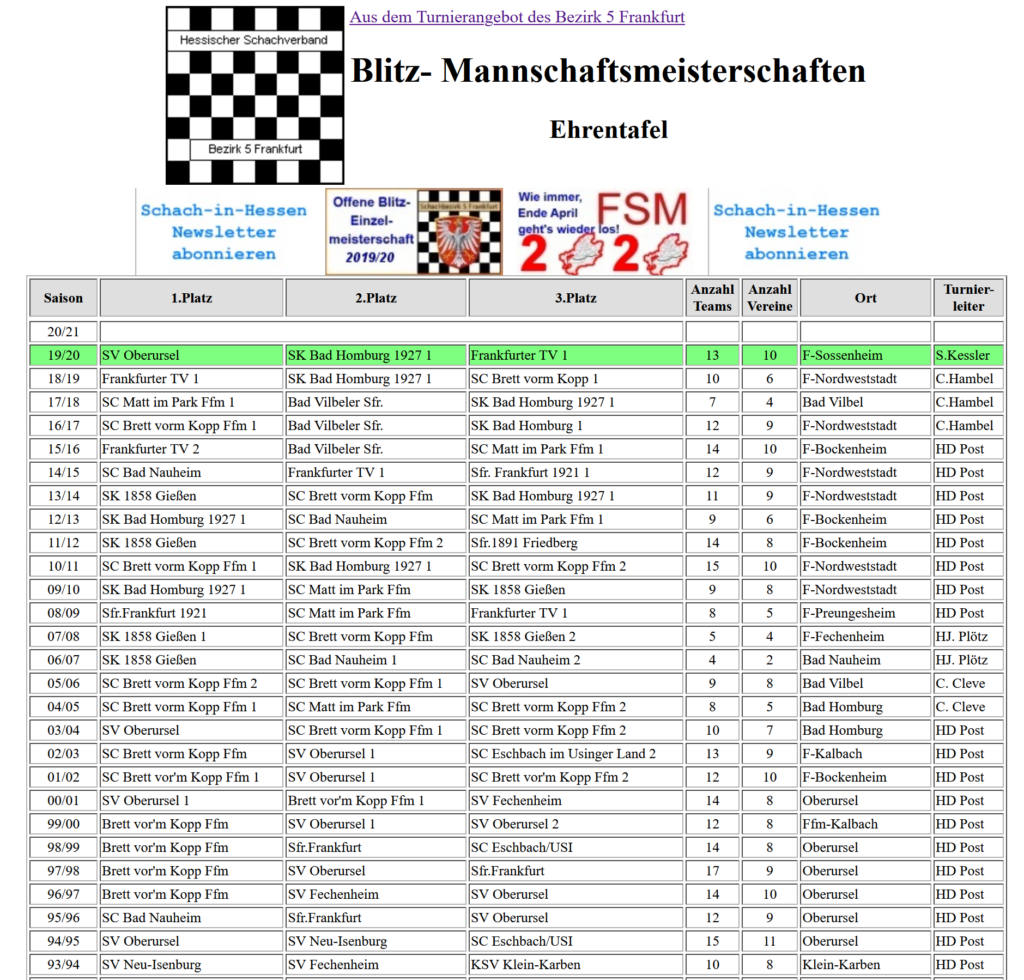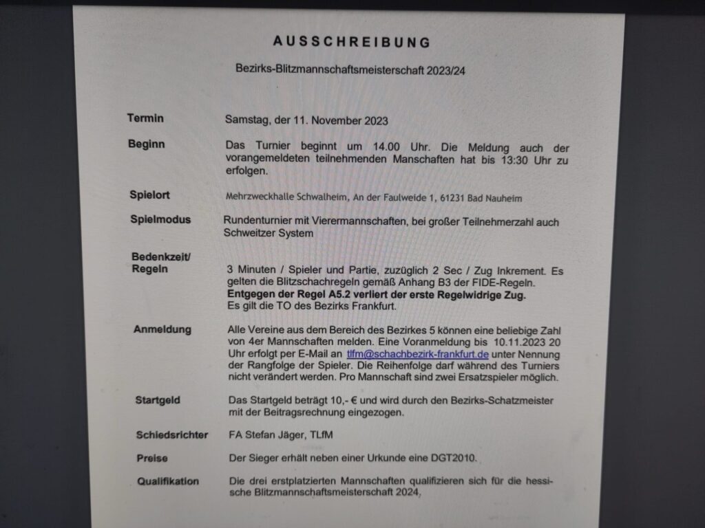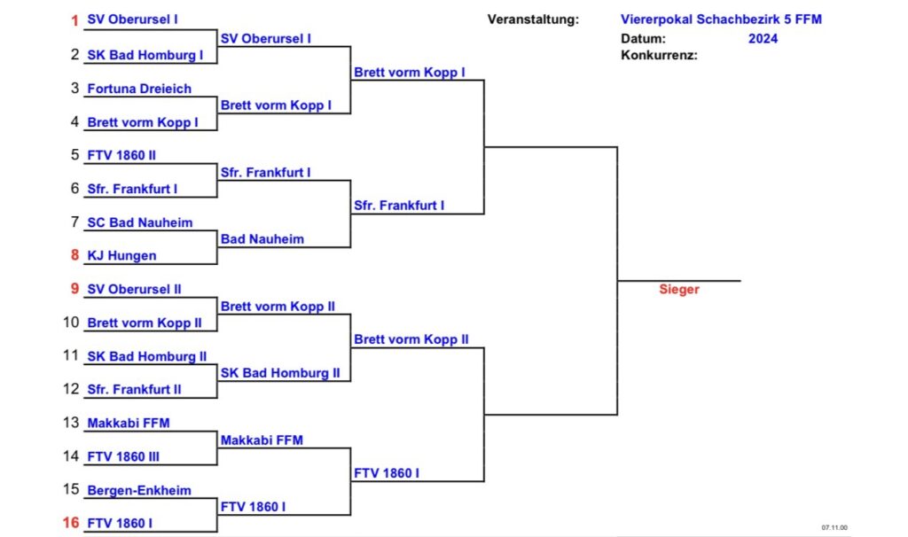 Der Viererpokal (Infos beim Schachbezirk Frankfurt) ist übrigens ein Turnier, an dem wir jedes Jahr mit großer Begeisterung und mittelmäßigem Organisationstalent teilnehmen. Vier Spieler pro Mannschaft, K.o.-System, immer montags am Zoo – und traditionell scheitern wir eher an uns selbst als am Gegner.