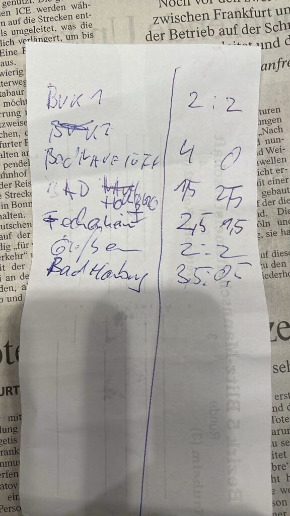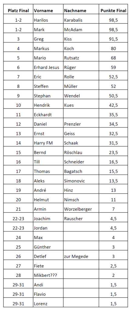 Nachtrag: Erhard gewinnt gegen Mario. Ergebnis wurde falsch eingetragen. 🤣🤣🤣