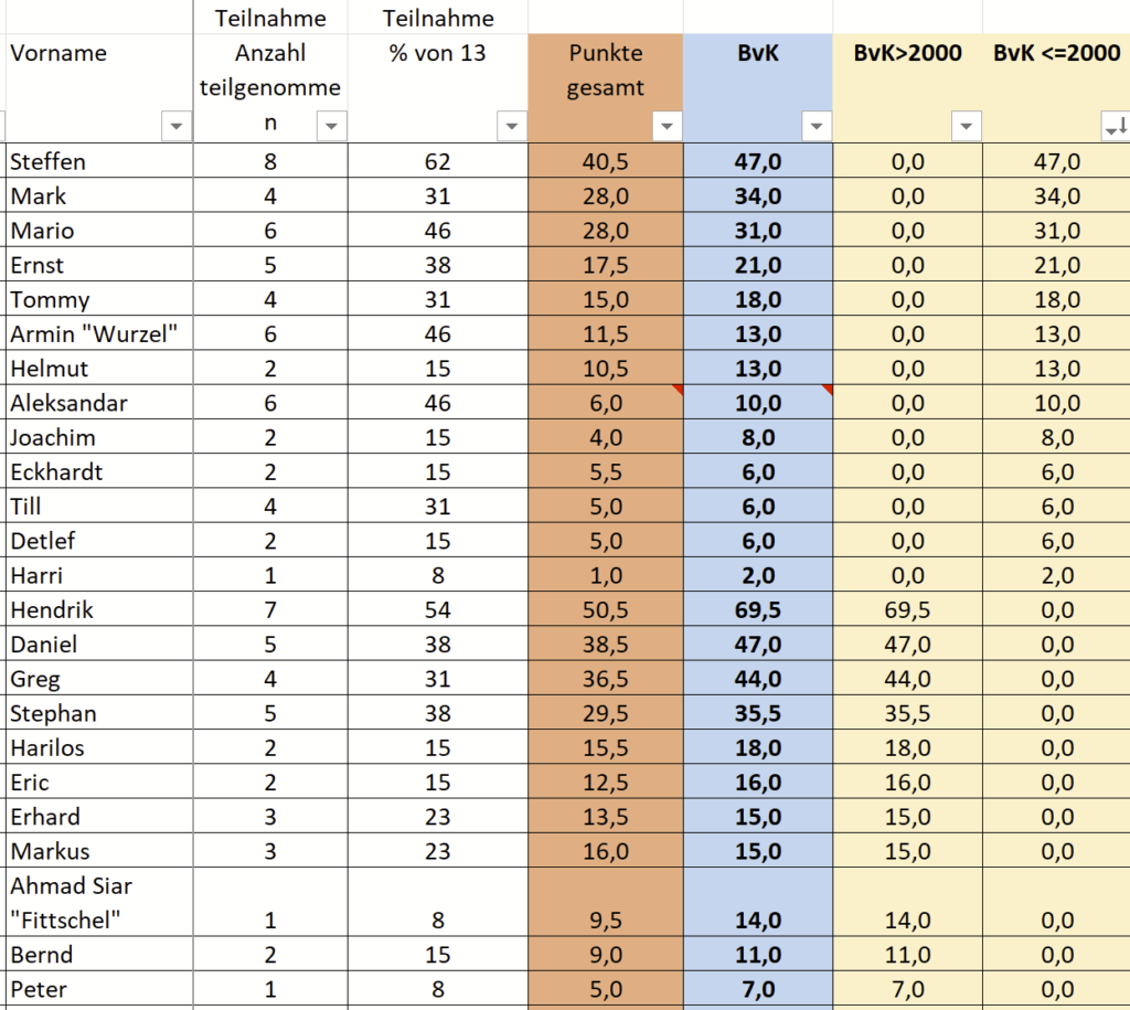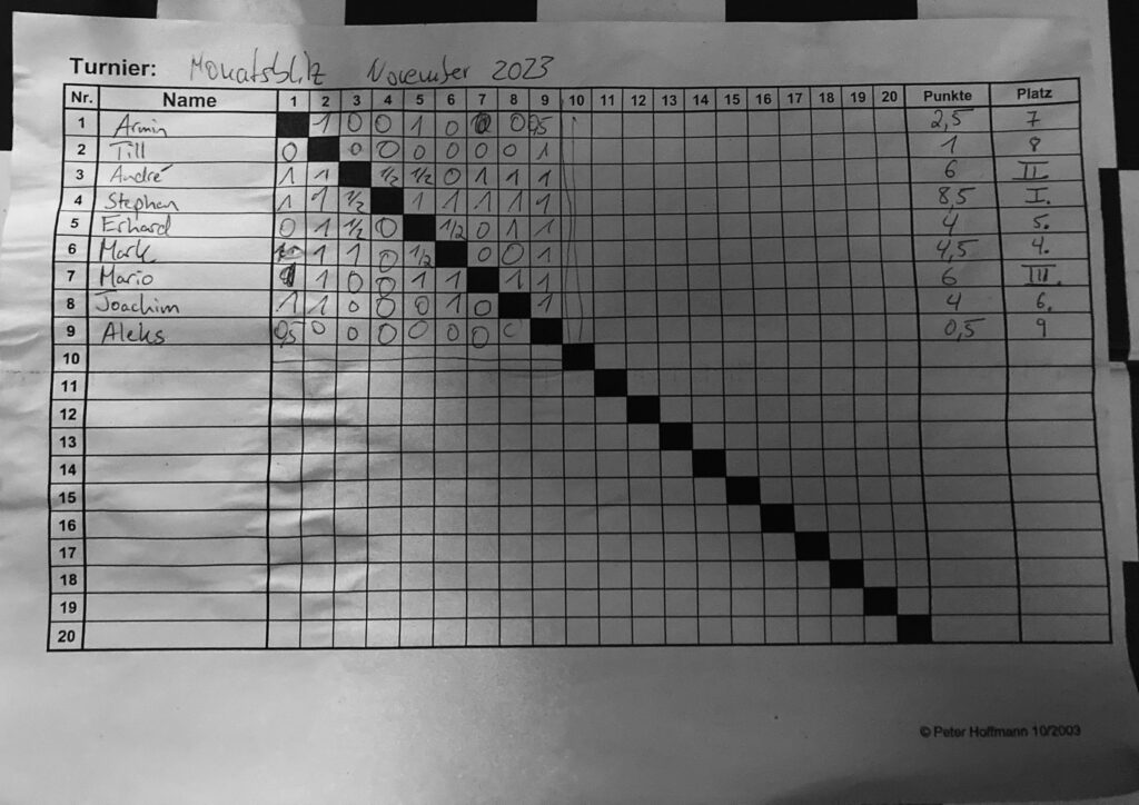 Wir danken Detlef für die sorgfältige Führung der Wertung und allen Teilnehmern für ihr Engagement. Gemeinsam können wir unser Monatsblitz-Turnier noch attraktiver gestalten.