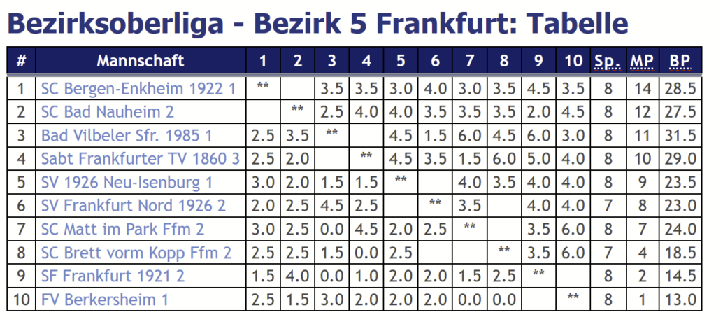- Runde 2 (07.11.2021): SC Bergen-Enkheim 1922 1 vs. SC Brett vorm Kopp Ffm 2 – 3,5:2,5